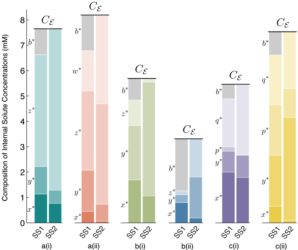 Steady State 1 (SS1) and SS2 internal solute concentrations. Solute concentrations inside the vesicle reactor, at spherical steady states SS1 and SS2, for each reaction scheme reported in Figure 2. Comparing SS1 and SS2 for each scheme, it can be observed that there are quantifiable differences in solute concentrations between steady states, but these differences are fairly small. Owing to the osmotic water balance, the total concentration of solutes inside the vesicle (height of the stacked bars) is always constrained to be equal to the total external solute concentration of the environment, Cε. Thus, in the vesicle reactor model, the main feature distinguishing steady states is vesicle size (see Section 4.2 for details). Symbol b∗denotes the steady-state concentration of the BTbuffer molecules trapped inside the vesicle. At SS2, b∗→ 0, due to large vesicle sizes, and the diffusing solutes constitute the majority of total internal concentration. The Supplementary Material supplies data supporting the figure.