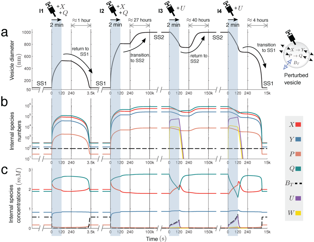 Switching dynamics: bistability in two unimolecular reactions. Encapsulating two unimolecular reactions X → Y and P → Q in the variable-volume vesicle reactor model gives a bistable system under the correct parameter regime (Figure 2c(i)). Below, switching dynamics between steady states SS1 and SS2 are demonstrated by injecting molecules into the reactor by a simulated syringe. Following four different two-minute injections of molecules, changes in (a) spherical vesicle diameter, (b) vesicle internal species numbers and (c) vesicle internal species concentrations are monitored. Injection I1 releases both X and Q into the vesicle at a linear rate of 1000 molecules per second. This perturbation is not sufficiently strong to switch the reactor into SS2, but injection I2, releasing X and Q at 3500 molecules per second, is able to prompt the transition. Once in the larger vesicle SS2 state, the switch back to SS1 is achieved by injecting a new species U into the reactor. This species undergoes reaction , which depletes Q inside the vesicle by quickly transforming it into waste W (k = 60.0) that rapidly diffuses out of the compartment (). Injection I3 releases U into the vesicle at a rate of 8000 molecules per second, but cannot initiate the switch back to SS1. Injection I4 successfully completes the transition, releasing U at a rate of 10, 000 molecules per second. Time is divided into windows to accommodate different timescales (from minutes to days).