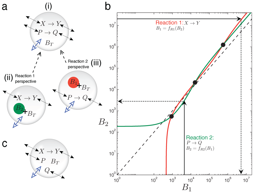 Graphical intuition into emergent bistability through osmotic coupling. (a)Emergent bistability in the vesicle reactor model: (i) two chemically-independent unimolecular reactions can be understood by taking a “reactions-eye view” from the perspective of each reaction; (ii) from the perspective of the X → Y reaction (Reaction 1), all molecules associated with the P → Q reaction simply act as extra inert buffer (B2) in addition to the trapped impermeable buffer molecules BT inside the compartment; (iii) conversely, from the perspective of the P → Q reaction (Reaction 2), all molecules associated with the P → Q reaction act as extra inert buffer (B1). (b) Graph showing how the total steady-state particle number of each reaction responds to the extra number of buffer molecules that the other reaction is providing, where Reaction 1 has the y-axis as independent and Reaction 2 has the x-axis as independent. The three cross points represent fulfillment of the cyclic condition referred to in the text. The dotted line shows the relation B1 = B2. Two chemically-independent reaction sets with identical stoichiometry and identical kinetic constants would give curves that are reflections in this line. (c) When the chemical transformation between P and Q is removed, the latter solutes simply diffuse across the membrane until their respective concentration gradients are equalized. A unimolecular reaction sharing the vesicle compartment with such inert diffusing species cannot be bistable (see the text).