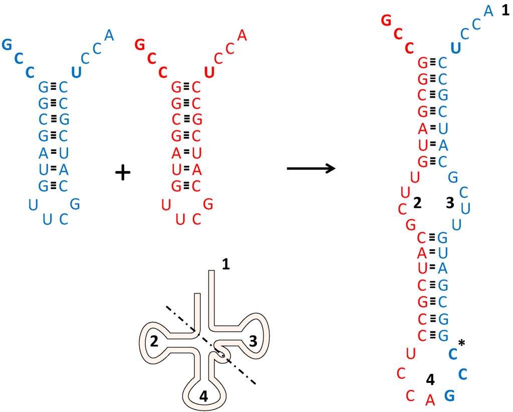 How to get a tRNA precursor. Two (identical) hairpin-loop structures (red and blue) can form one extended RNA molecule upon unfolding. Regions in this precursor are compared to a schematized version of a present day tRNA. 1: CCA acceptor stem; 2: D-arm; 3: T-arm; 4: Anticodon containing loop. The dotted line indicates the schematized separation between acceptor-TψC stem-loop and anticodon-D stem-Biloop [52]. The anticodon and the discriminator nucleotide U are shown in bold face. Hydrogen bonds are shown as stripes. * In the anticodon containing loop further insertions and deletions are needed. Here two identical molecules (accepting glycine) are depicted, however the extended molecule can also be formed by slightly different non-identical molecules. For further details see text.
