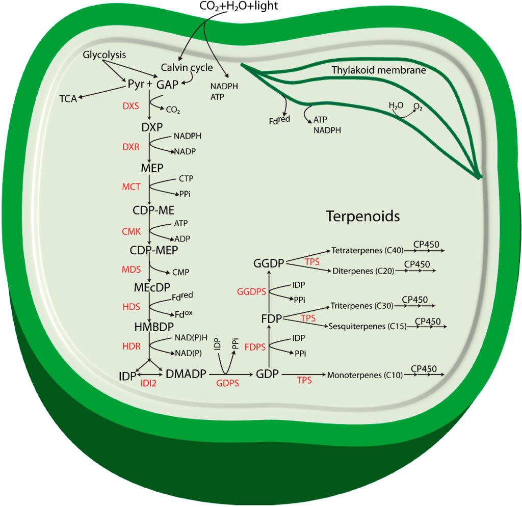 Proposed terpenoid biosynthesis via the methylerythritol-4-phosphate (MEP) pathway in cyanobacteria. Abbreviations: Pyr: Pyruvate; GAP: glyceraldehyde 3-phosphate; DXP: 1-deoxy-d-xylulose 5-phosphate; MEP: methylerythritol-4-phosphate; CDP-ME: 4-(cytidine 5'-diphospho)-2-C-methyl-d-erythritol; CDP-MEP: 2-phospho-4-(cytidine 5'-diphospho)-2-C-methyl-d-erythritol; MEcDP: 2-C-methyl-d-erythritol 2,4-cyclodiphosphate; HMBDP: 4-hydroxy-3-methylbut-2-enyldiphosphate synthase; IDP: isopentenyl diphosphate; DMADP: dimethylallyl diphosphate; GDP: geranyl diphosphate; FDP: farnesyl diphosphate; GGDP: geranylgeranyl diphosphate; DXS: 1-deoxy-d-xylulose 5-phosphate synthase; DXR: 1-deoxy-d-xylulose 5-phosphate reductoisomerase; MCT: 2-C-methyl-d-erythritol 4-phosphate cytidylyltransferase; CMK: 4-(cytidine 5'-diphospho)-2-C-methyl-d-erythritol kinase; MDS: 2-C-methyl-d-erythritol 2,4-cyclodiphosphate synthase; HDS: 4-hydroxy-3-methylbut-2-enyl diphosphate synthase; HDR: 4-hydroxy-3-methylbut-2-enyldiphosphate reductase; IDI: isopentenyl diphosphate isomerase; GDPS: geranyl diphosphate synthase; FDPS: farnesyl diphosphate synthase; GGDPS: geranylgeranyl diphosphate synthase; TPS: terpene synthase; CP450: cytochrome P450 monooxygenase.