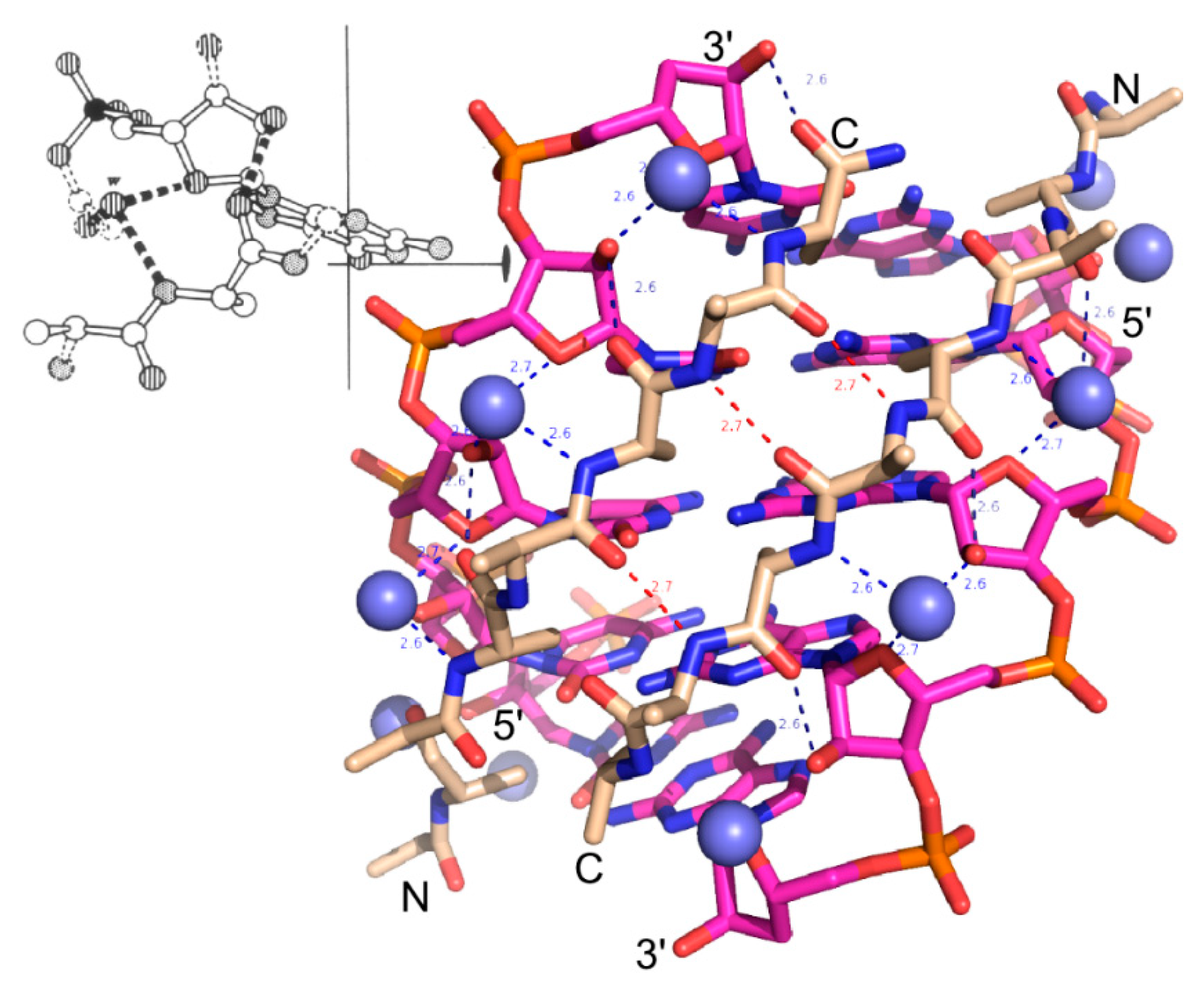 Stereochemistry of peptide-RNA conformational complementarity [1]. The minor groove in double-stranded RNA (magenta) complements the preferred right-hand twist of antiparallel β hairpin structures (wheat). Adjacent nucleotide and peptide strands are parallel (5'-3'; N-C) and the two sets are antiparallel. Van der Waals distances between peptide and nucleotide components are optimal precisely at a peptide radius for which there are exactly two amino acids per base. (Inset) The double-double helix is also stabilized by recurring hydrogen bonds between peptide carbonyl and the ribose 2'OH groups and between amide nitrogens and water molecules (blue spheres) between the ribose O1 and 2'OH groups. The resulting hydrogen-bonded network stabilizes a ribose orientation such that the 3'OH group is poised to serve as a nucleophile for polymerization.