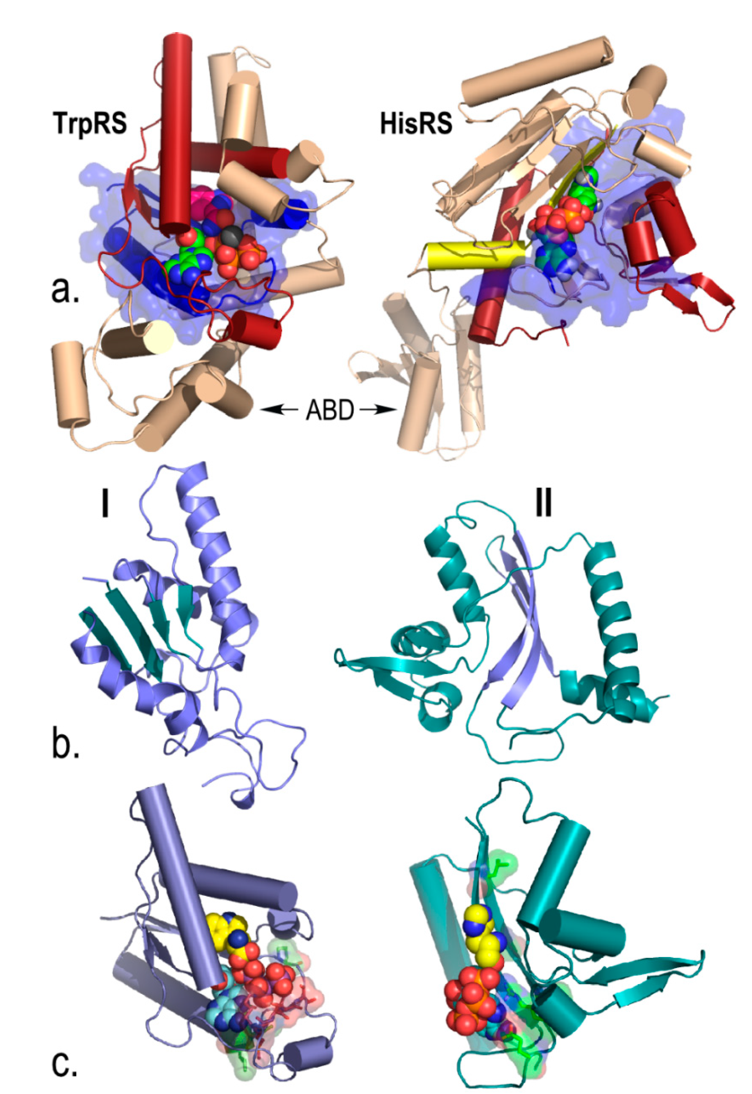 Urzymes isolated from Class I TrpRS (130 amino acids) and Class II HisRS (124 amino acids). (a) Monomer architectures. Both enzymes are dimeric. Monomers consist of two consensus domains, catalytic and anticodon-binding (ABD). The 46-amino acid ATP binding sites are blue and bounded by transparent surfaces; the remainder of the Urzymes are red. Catalytic domains of both also include insertions, colored amber. Active-site ligands are shown as spheres; (b) Secondary structures are dissimilar; Class I is a Rossmann fold with parallel β-strands; Class II is an antiparallel structure; (c) Amino acid (yellow) and ATP (cyan) substrates are spheres. Stick models of Class I-defining signatures PxxxxHIGH (green) and KMSKS (red) and Class II Motif 2 (green) are surrounded by transparent surfaces to reveal catalytically important interactions with ATP. The cartoons are based on crystal structures of the full-length enzymes. However, long-time MD simulations of both Urzymes in the presence of both substrates have shown that the structures shown here persist, but that in the absence of tryptophan the Class I specificity helix above the bound tryptophan re-orients, removing several key interactions involved in specific recognition [21,25,26].