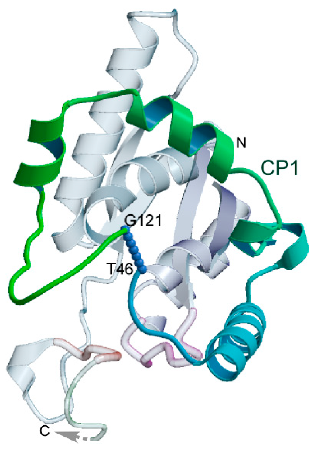 Relationship between TrpRS Urzyme and connecting peptide 1 (CP1). The alpha carbons to which the N and C termini of the insertion attach are separated by almost exactly the distance of a peptide bond (blue dots). This enables its removal by protein engineering, which was accomplished using the Rosetta design program [15,21]. The dashed arrow indicates where the anticodon-binding domain attaches (Adapted from [15]).