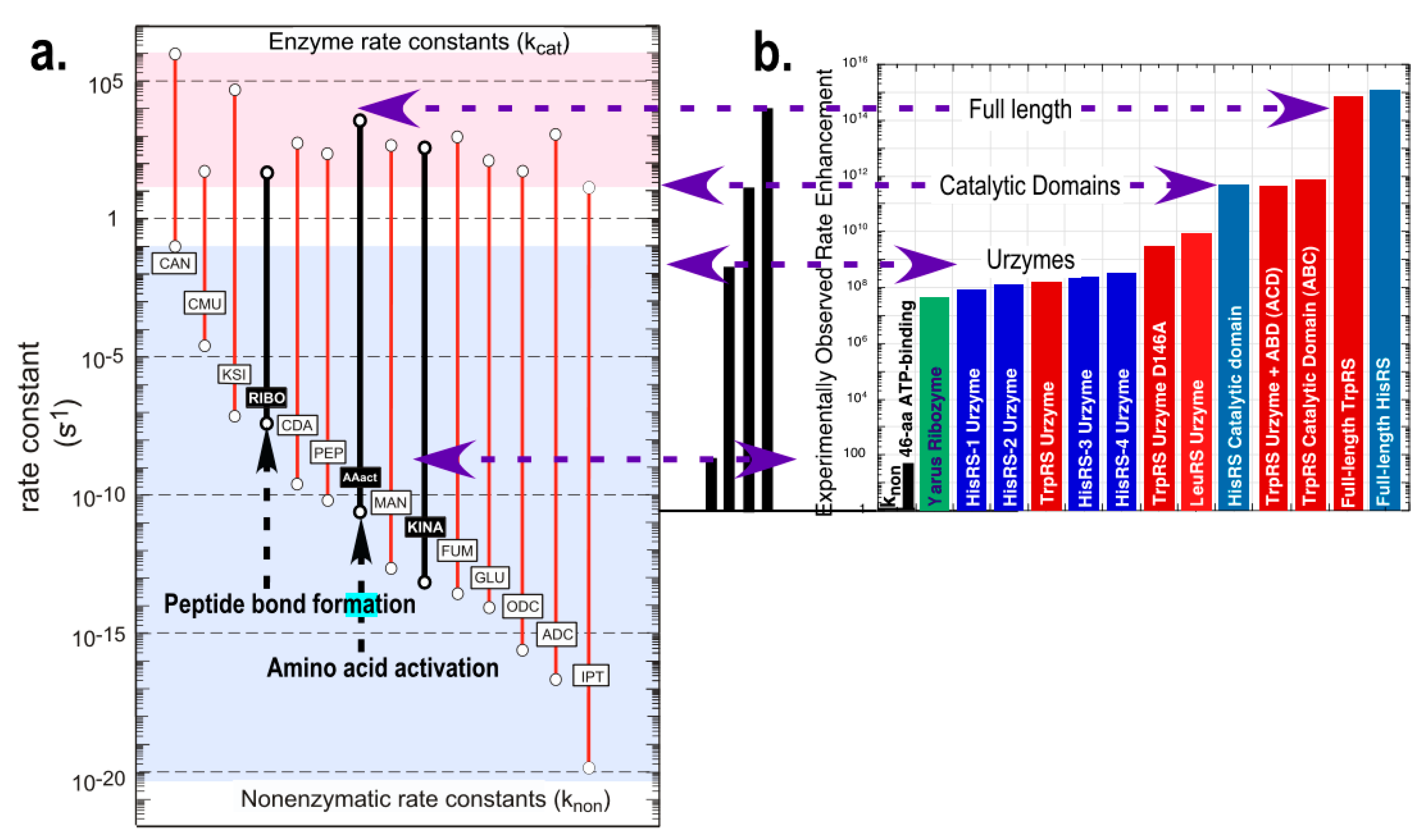 Quantitative framework in which to assess the catalytic significance of Urzymes and various other putative stages of aaRS evolution. (a) Rate accelerations estimated from experimental data for single substrate (red) and bi-substrate (Black, Bold) reactions adapted from [31] to include uncatalyzed and catalyzed rates of bi-substrate reactions of the ribosome [22,23], amino acid activation [32], and kinases [33]. Second-order rate constants (black bars) were converted into comparable units by multiplying by 0.002 M, which is the ATP concentration used to assay the catalysts shown in B; (b) Experimental rate accelerations for amino acid activation, estimated from steady-state kinetics of 32PPi exchange as kcat/KM for catalysts derived from Class I and Class II aminoacyl-tRNA synthetases [14,21]. Vertical scales in (a) and (b) are the same, and the origin of the histogram in (b) is set equal to the uncatalyzed rate of amino acid activation (AAact) in (a). Red bars denote Class I Tryptophanyl- and Leucyl-tRNA synthetase constructs, blue bars denote Class II Histidyl-tRNA synthetase constructs, black vertical lines denote catalysis by 46-residue ATP binding sites, and green denotes a ribozymal catalyst [34] for a different amino acid activation reaction, included for comparison. Research presented in (a), (b) was originally published in [13]. © The American Society for Biochemistry and Molecular Biology.