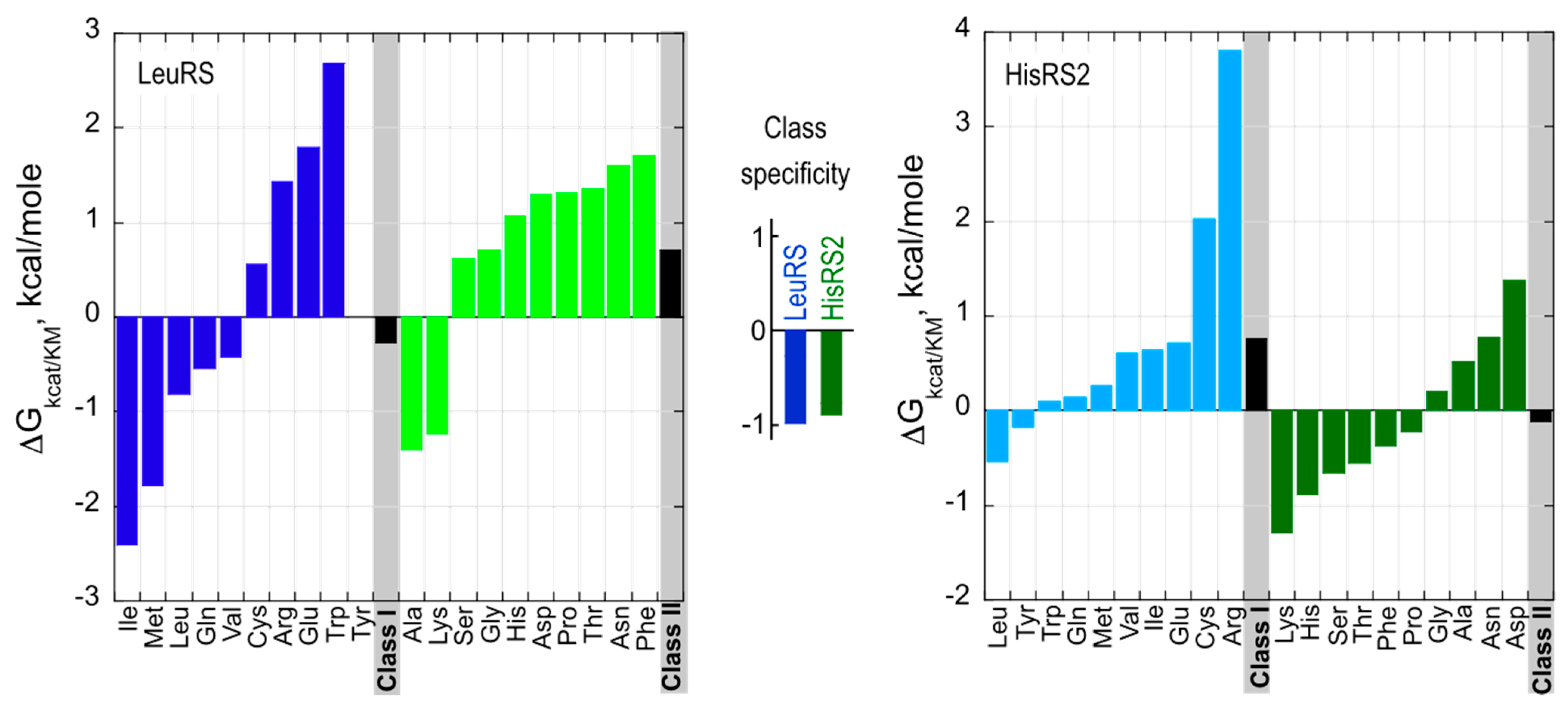 Amino acid specificity spectra of Class I LeuRS and Class II HisRS2 Urzymes. The net free energy for specificity of Class I and II Urzymes for homologous vs. heterologous substrates, i.e., ΔG(kcat/KM)ref – ΔG(kcat/KM)amino acid (i), where ref is the cognate amino acid, is approximately 1 kcal/mole for both Class I and II Urzymes (center). Class I amino acids are colored blue; Class II amino acids are colored green. Bold colors denote substrates from the homologous Class; pastel colors denote heterologous substrates.