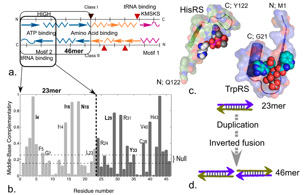 An interesting footnote is that coding sequences for the 46-residue ATP binding site of TrpRS (i.e., the TrpRS 46mer) exhibit significantly elevated mean middle codon base pairing in multiple antisense alignments. Middle bases of the second half of this segment have significantly elevated complementarity to the middle bases in the first half, exhibiting evidence for coding by a palindromic RNA sequence and hence by a hairpin (Figure 7a,b). Such ancestry introduces an even simpler, 23 amino acid precursor to the ATP binding site of both aaRS superfamilies. Remarkably, the major Class I and II ATP binding determinants in aaRS reside at the N-terminus of the Class I 46mer and at the C-terminus of the Class II 46mer. Thus both are retained in corresponding, complementary halves of the 46mer gene encoded by the same half of the sense/antisense gene, hence would be retained in the 23-mers (Figure 7c). Thus, the 46mers might themselves have arisen spontaneously from a simpler 23-residue sense/antisense gene by formation and subsequent evolution of an inverted repeat (Figure 7d).