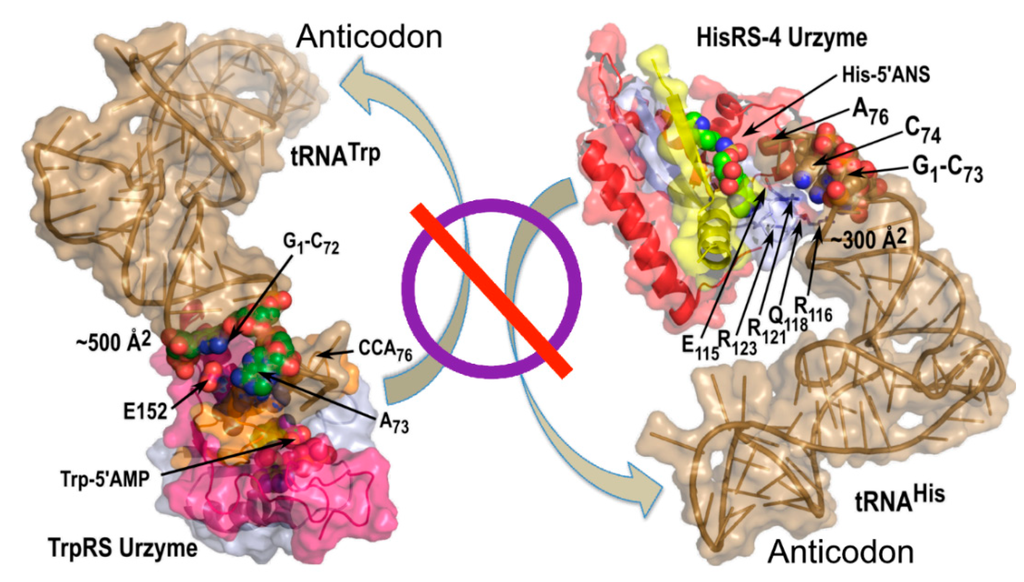 As the fundamental gap in understanding the origin of life is the emergence of the genetic code, it makes sense to study how the molecular machinery developed that translates that code today: the ribonucleoprotein complexes of aminoacyl-tRNA synthetaseses with their cognate transfer RNAs. A significant unification underlying the origins of translation was the recognition that the two distinct aminoacyl-tRNA synthetase superfamilies are, very probably, fundamentally related to one another, by sense/antisense ancestry. This duality was originally proposed by Rodin and Ohno [8] in response to the recognition that the 20 amino acids were activated and transferred to cognate tRNAs by two entirely distinct superfamilies of aminoacyl-tRNA synthetases [9,10,11]. Much of our recent research has tested biochemical [12,13,14,15,16] and bioinformatics [17] predictions of that model, and examined a designed sense/antisense gene with two functional products [18,19,20].