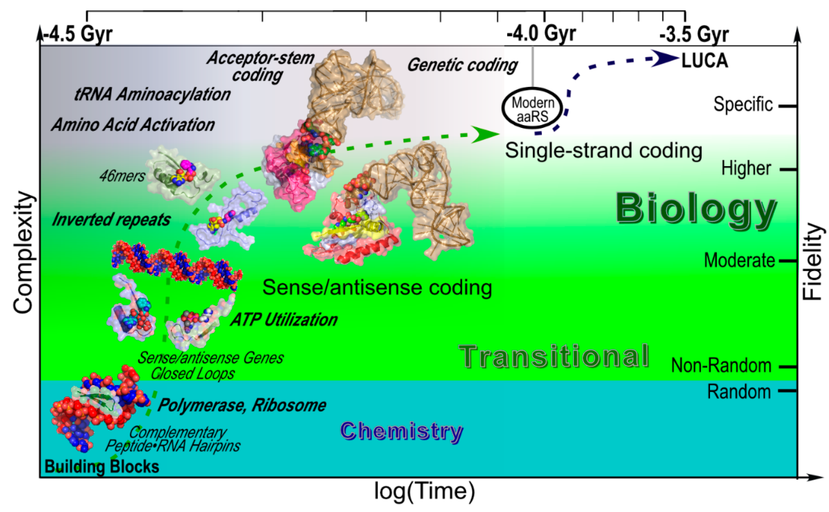 Detailed scenario for the emergence of peptide and RNA polymers and steps toward the creation of the genetic code. Approximate time intervals run from the formation of liquid water on the earth to the appearance of the last universal common ancestor (LUCA) and specifically plot stages in the evolution of the aaRS that we have documented either by model building (Figure 1 and Figure 2) or experiments (Figure 5), and which therefore are arguable intermediates that do not require prior evolution of human technology. Major biochemical events are in italicized bold face. Sense/antisense coding appeared with the first reciprocally autocatalytic peptide–RNA complex and persisted until the evolution of aminoacyl-tRNA synthetases, tRNAs, and ribosomes enabled higher-specificity genetic coding.