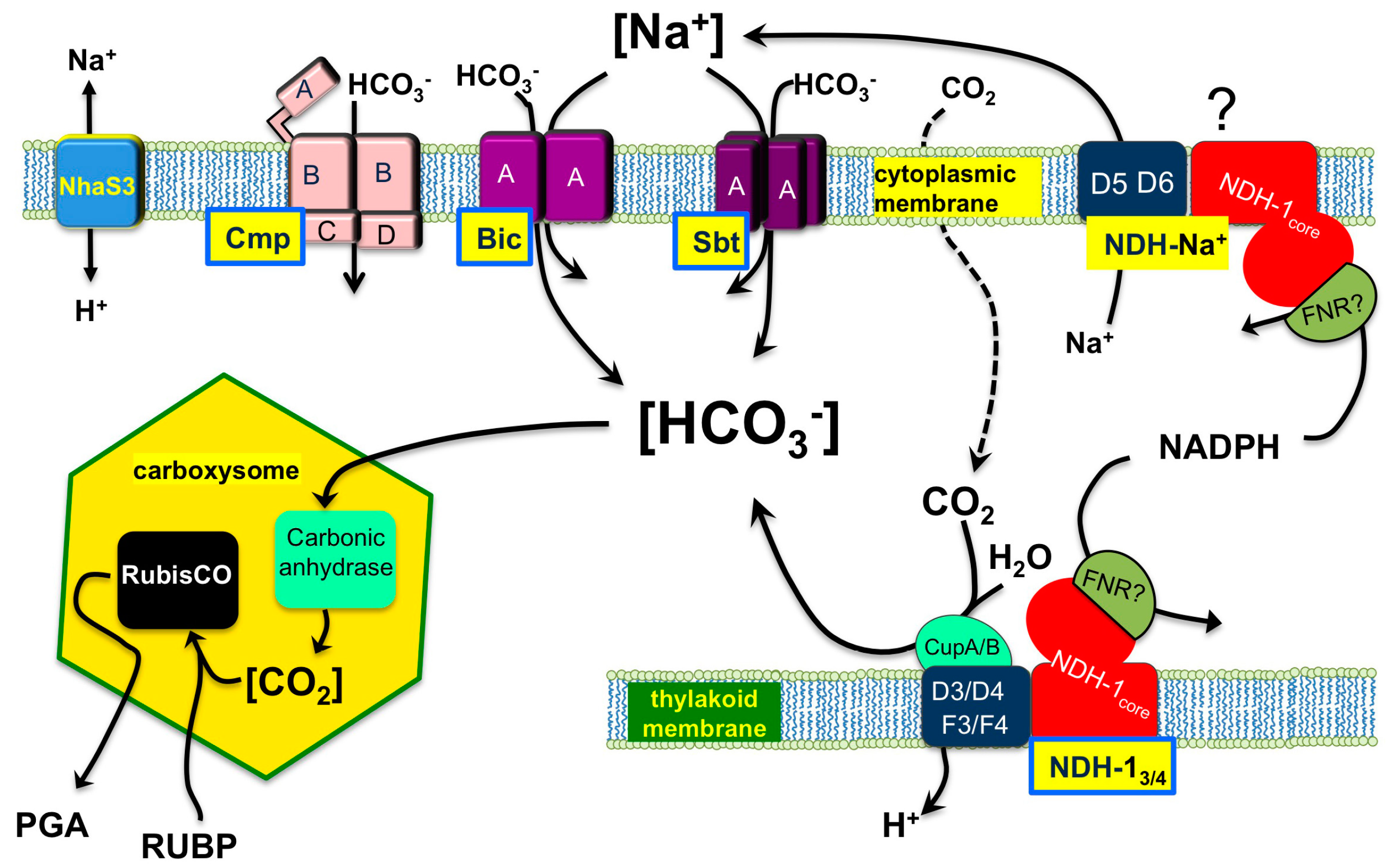 This is a process that uses cellular energy and, therefore, the CO2 hydration reaction is driven far towards the HCO3− product. Because these systems are not transporting CO2, but consuming it with high efficiency into HCO3−, they maintain a diffusion gradient to facilitate rapid net CO2 flux into the cell. Two CO2 uptake systems were recognized in Synechocystis sp. PCC 6803, often used as a model cyanobacterium. The high affinity, Ndh-13, is strongly upregulated when the cells are exposed to a limiting CO2 level. The subunits are encoded by ndhF3, ndhD3, cupA and sll1735. The low affinity Ndh-14 system is constitutively transcribed and encoded by ndhF4, ndhD4, cupB [23,25,26,27,28]. The central membrane component of the respiratory Ndh-1 complex, NdhB, is involved in both systems; its inactivation results in a high CO2 requiring mutant unable to take up CO2 but also inability to utilize extracellular glucose because of impaired cyclic electron transport [27]. An additional, more poorly understood NDH-1 complex containing the NdhD5 and NdhD6 subunits has been tentatively assigned (see “?” in Figure 1) a function in augmenting the Na+ gradient across the cytoplasmic membrane based upon findings with Anabaena Na+ tolerance [29], sequence similarities to the Bacillus MRP system [30], and the fact that it is coordinately regulated with the Na+/HCO3− symporter, SbtA, discussed below [31,32]. Despite impressive progress in the clarification of the Ndh-1 subunit composition and its organization [21,33], the mechanism of CO2 conversion to HCO3− in the thylakoid membranes and its association with the photosynthetic electron transport is not understood [2,26]. Clearly, the HCO3− produced is released into an environment where its concentration may exceed 50 mM, i.e., against the chemical equilibrium.