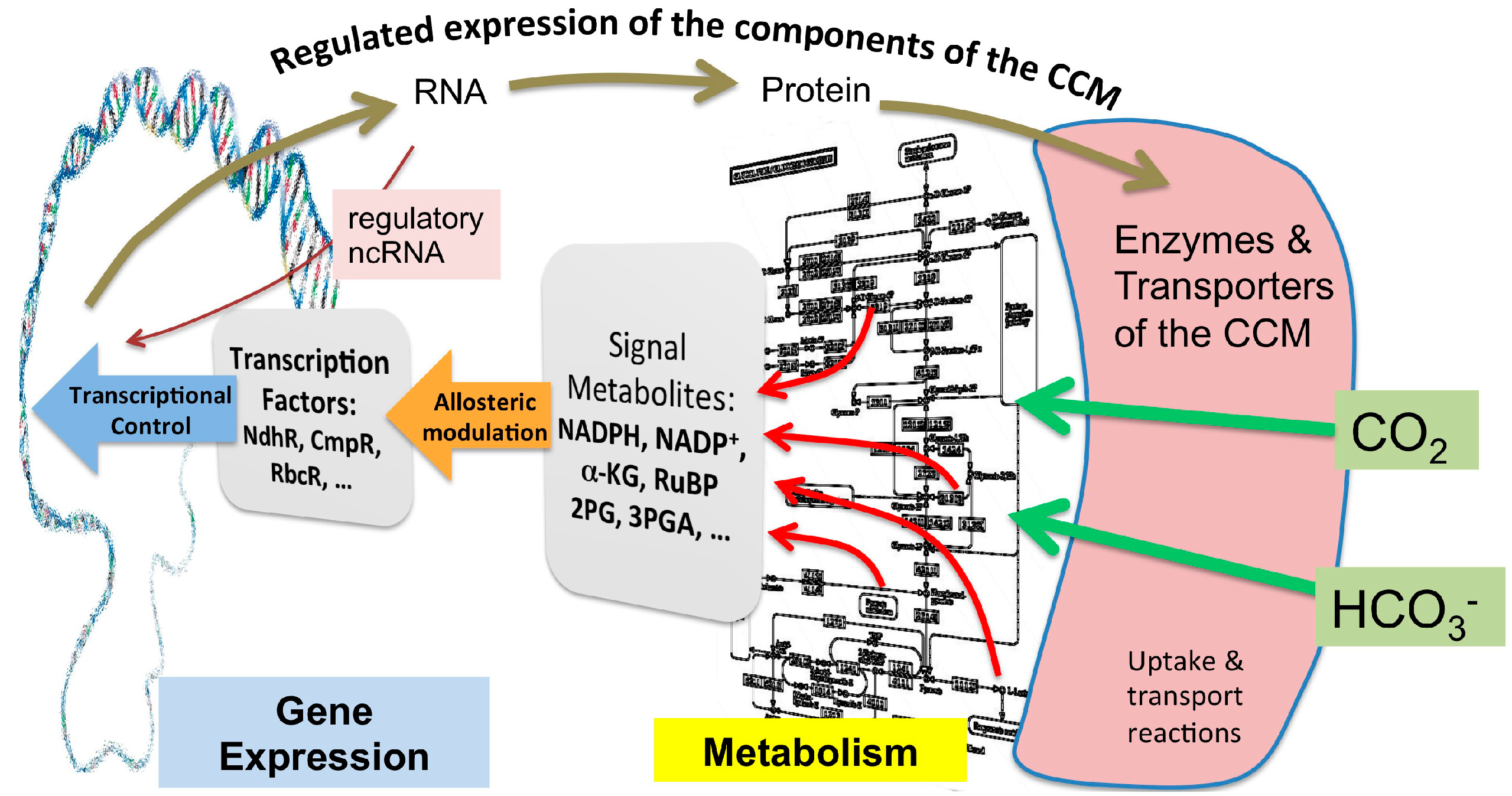 The general function, structure and regulation of the cyanobacterial CCM has been analyzed in great detail during recent years. Almost all proteins and the corresponding genes for CCM components are known and well characterized in model cyanobacteria. The increasing number of complete genome sequences from cyanobacteria of different ecological and phylogenetic origins now allows investigating, whether or not distinct differences in the function and structure of the CCM evolved as adaptation to different ecological niches. Moreover, the timing of the primary origin of the CCM is still not known and should be analyzed using the now existing huge genome databases. Many of the genes coding for CCM components show differential regulation as a response to different CO2 concentrations but also to many other environmental stimuli such as high light or the availability of organic carbon sources. Especially, the LC-induced up-regulation of the Ci transporters via the action of LysR-type transcriptional factors is quite well understood in some model strains and in biochemical studies. However, even in these cases, the in vivo integration of metabolic signals, transcriptional factor activities and gene expression kinetics shows some conflicting data pointing at a more complex regulatory network in the living cells than anticipated from the analysis of isolated components in vitro. Compared to regulation of the Ci uptake components, mechanisms guaranteeing the increase of carboxysome number and the rerouting of the carbon assimilation are almost unknown. Here, novel players seem to be involved that act independently from the transcriptional factors. Small regulatory RNAs and direct posttranslational regulation of protein activities are prime candidates for additional levels of Ci-depending acclimation processes.