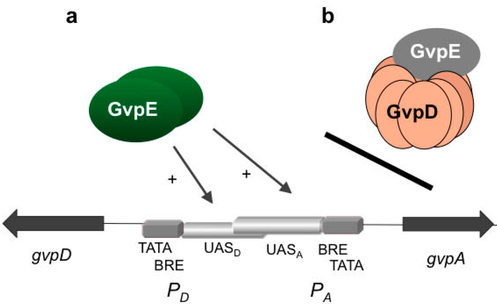 Activation of PA-PD by GvpE (a) and repression by GvpD (b). Schematic representation of the region between gvpA and gvpD and the two oppositely-oriented promoters PA and PD. TATA-box and BRE are shown in grey, and the two UAS elements are partly overlapping in the center in light grey. The reading frames gvpD and gvpA are represented by dark arrows. (a) Activation of transcription by GvpE should involve binding of GvpE, presumably as a dimer, at the respective UAS element and recruitment of TFB, TBP and of the RNA polymerase. (b) In the presence of GvpD, the interaction of GvpE-GvpD leads to a strong reduction in the amount of GvpE and the repression of gas vesicle formation.