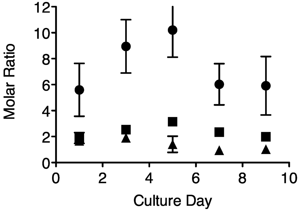 Figure 1 shows the molar ratios of PSI:PSII, cytochrome b6f:PSII and RUBISCO:PSII in Prochlorococcus marinus MIT 9313 with days in culture following a one in four dilution of the culture into fresh Pro99 medium. The PSI:PSII ratio nearly doubled over the first five days in culture, and then declined. Over this period the quantum yield of PSII (FV/FM) did not change (data not shown). For consistency, all subsequent measurements were conducted on cells three to four days post dilution; after two to three days of exponential growth.