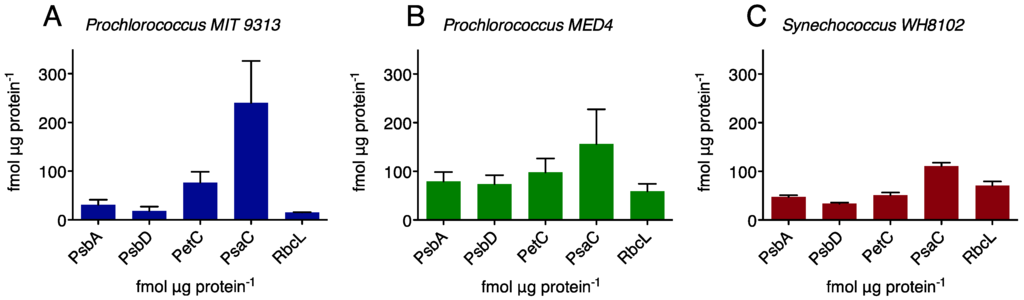 Molar immunoquantitations of representative protein subunits PsbA (PSII); PsbD (PSII); PetC (Cytb6f complex); PsaC (PSI) and RbcL (RUBISCO large subunit) (a) Prochlorococcus MIT 9313; (b) Prochlorococcus MED 4; (c) Synechococcus WH8102. n = 6 independent determinations, ±95% confidence interval.