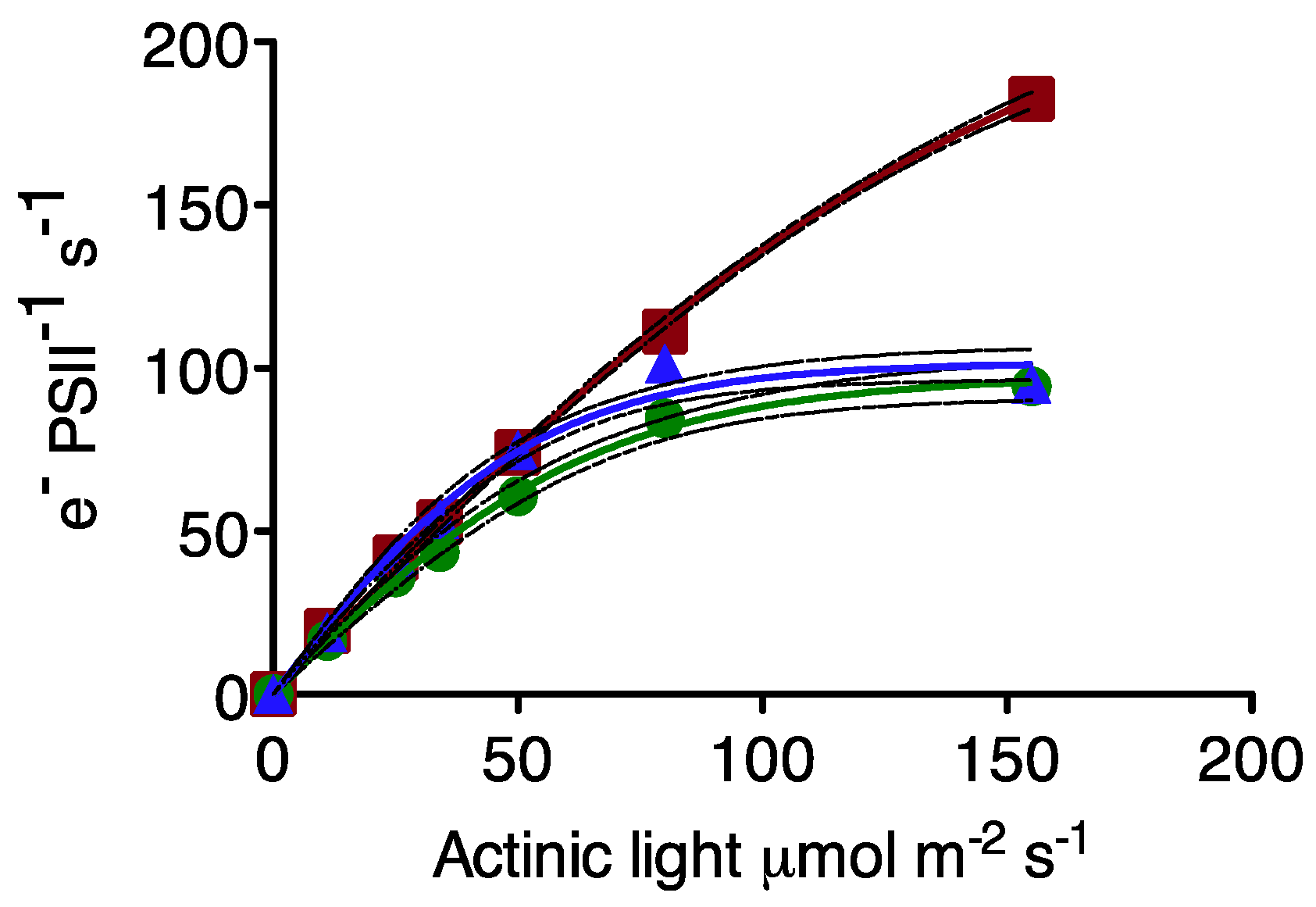 Light response of PSII electron transport (e− PSII−1·s−1). Prochlorococcus MIT 9313: blue triangles; Prochlorococcus MED 4: green circles; Synechococcus WH8102: red squares. For clarity each plotted point represents the average of seven to eight independent determinations measured on separate cultures. The solid lines are hyperbolic tangent fits of the data; dotted lines show 95% confidence intervals on the regression.