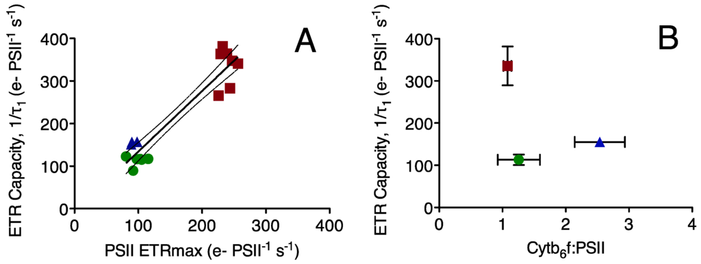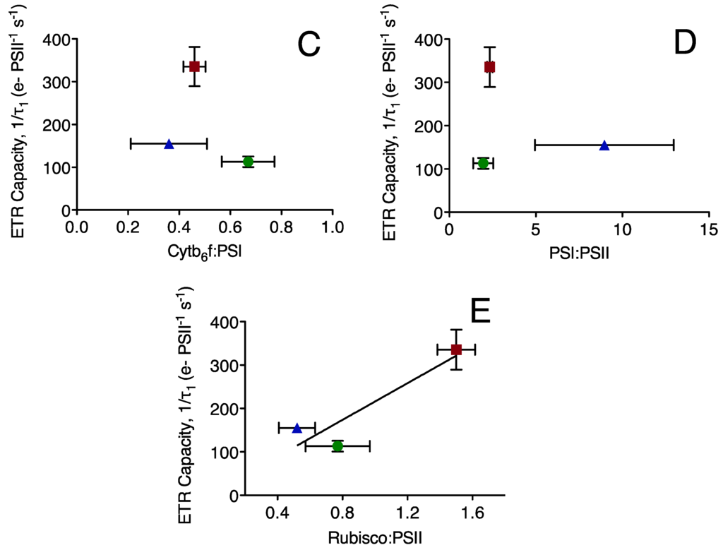 To determine a mechanistic basis for the differences in photosynthetic electron transport we plot the capacity for electron transport away from PSII (ETR capacity) versus other measured parameters (Figure 4). As expected, the ETR capacity is strongly correlated to ETRmax, the electron transport rate under saturating light, with an R2 of 0.89 (Figure 4A). ETR capacity is not correlated to the molar ratio of cytochrome b6f to PSII (Figure 4B), nor to the molar ratio of cytochrome b6f to PSI (Figure 4C) nor to the ratio of PSI to PSII (Figure 4D). This indicates that the capacity for electron transport away from PSII is not directly limited by the available pool of cytochrome b6f complexes serving PSII or PSI, nor by the pool of PSI extracting electrons from the inter-system electron transport chain. In fact, the strain with the lowest ratio of cytochrome b6f to PSII shows the highest rate of electron transport away from PSII. ETR capacity is, however, strongly correlated to the ratio of RUBISCO active sites (measured RbcL subunits) to PSII, with an R2 of 0.83 across the three strains (Figure 4E).