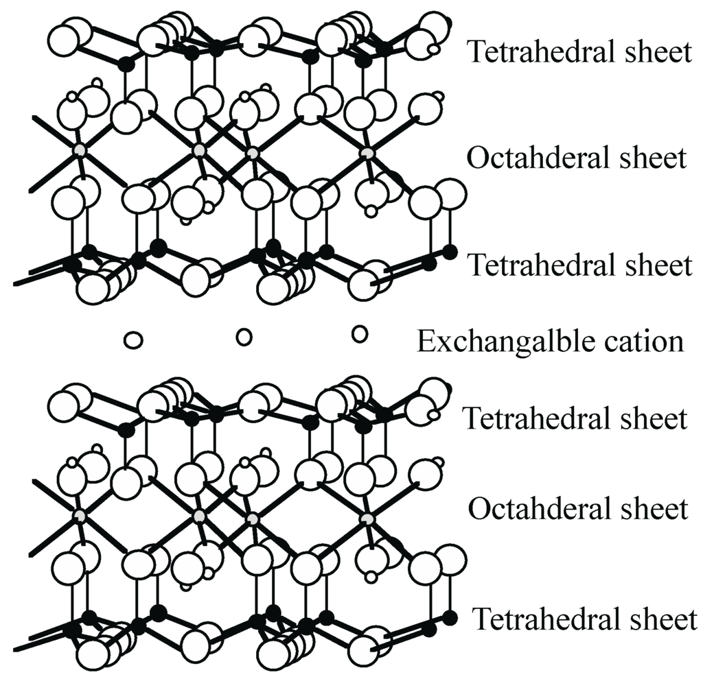 Smectite is a group including montmorillonite, beidellite, nontronite, saponite, hectorite, sauconite, and stevensite. The general structure of smectite is shown in Figure 1. Montmorillonite, beidellite, and nontronite are called dioctahedral smectite. The octahedral site is normally occupied by trivalent cations (e.g., Al3+, Fe3+, Mn3+). Saponite, hectorite, sauconite, and stevensite are called trioctahedral smectite. The octahedral site usually has divalent cations (e.g., Mg2+, Fe2+, Mn2+, Ni2+). Si4+ and Al3+ are mainly present in the tetrahedral site. One of the typical characteristics of the smectite group is the presence of an exchangeable cation (e.g., Na+, K+, Ca2+) between layers and smectite swells by intercalating water molecules between layers. Smectite can easily disperse in water and the interlayer cations can exchange with ionic organic molecules. Montmorillonite is frequently used in studies of the origin of life. The planar surface usually has a negative charge. The edge surface of montmorillonite has an isoelectric point (pH approximately 7). At pH < 7, the edge surface shows a positive charge and at pH > 7, it has a negative charge [15].