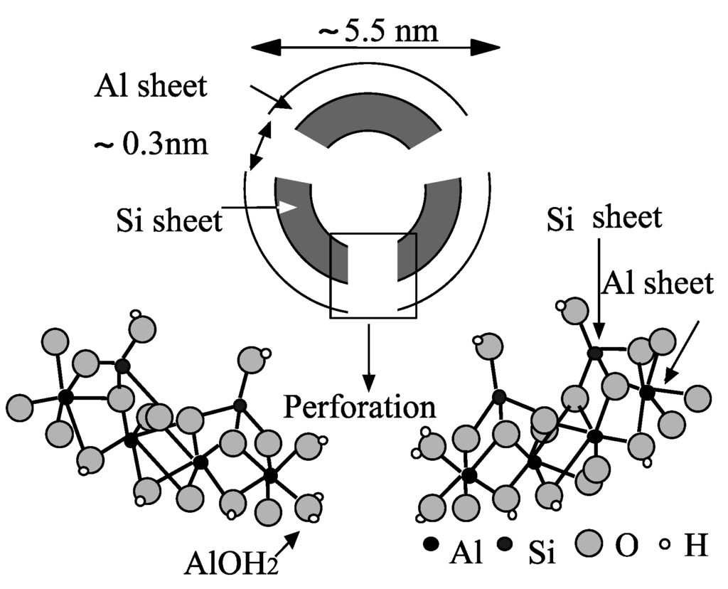 Allophane is a nanosized hydrated aluminosilicate with short-range order and an Al/Si ratio of 1 ~ 2 found in many soils derived from volcanic ash and weathered pumice. The unit particle of allophane consists of a hollow spherule with an outer diameter of 4–5.5 nm. The 0.7–1.0 nm thick spherule wall is composed of an outer gibbsitic sheet, to which O3SiOH groups are attached on the inside. Defects in the wall structure give rise to ~0.3 nm wide perforations (Figure 3). Unlike montmorillonite, allophane has neither a permanent negative charge nor exchangeable cations. Rather, the charge characteristics of allophane vary with pH, since the (OH)Al(OH2) groups exposed at wall perforations can either acquire or lose protons, depending on suspension pH. The point of zero charge of the allophane sample, used in this instance, is close to 6 [43].
