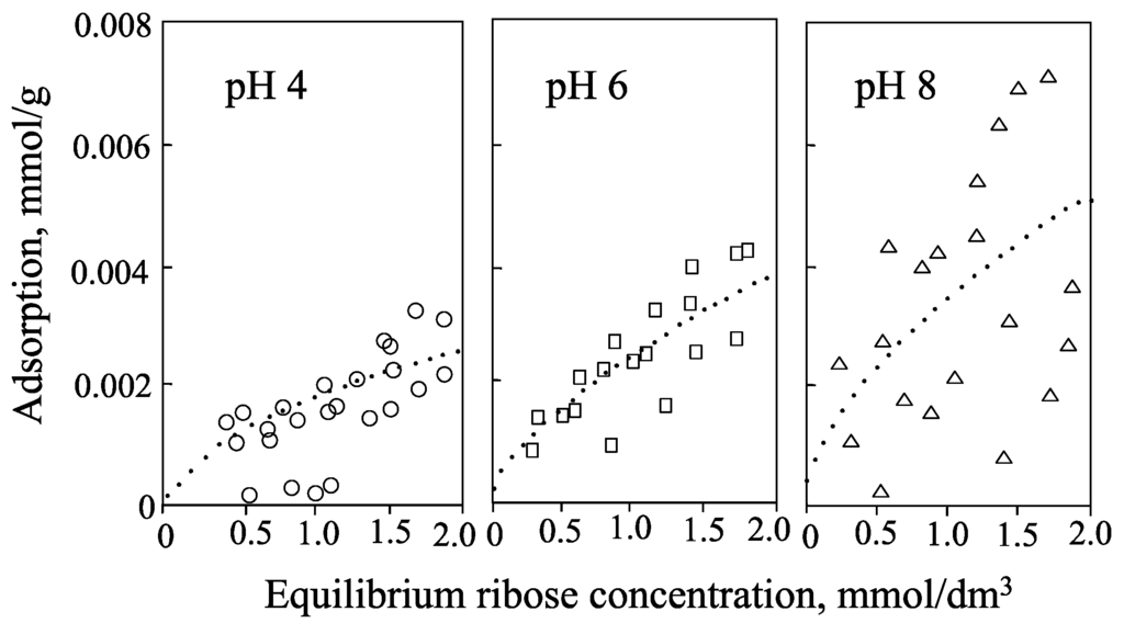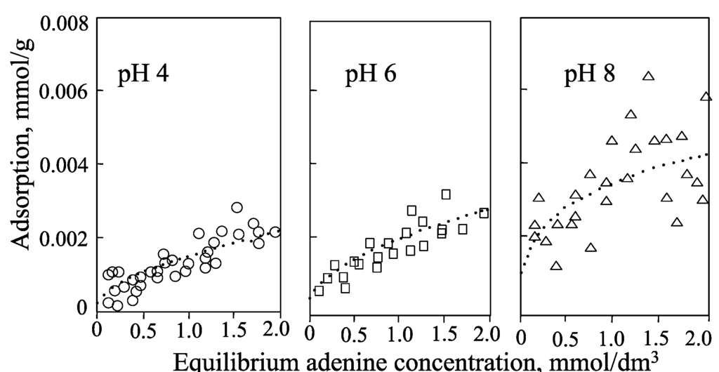 Hashizume et al. [18] previously determined the isotherms for the adsorption of adenine, cytosine, uracil, ribose, and phosphate by Mg2+-exchanged montmorillonite at pH 7–8. In their experimental condition, all isotherms were approximately linear lines. Under standard conditions, adsorption decreases in the following order: adenine > cytosine > uracil. The extent of adenine adsorption was 0.08 mmol·g−1 at 4 mmol·dm−3; cytosine adsorption was 0.15 mmol·g−1 at 15 mmol·dm−3 and uracil adsorption was 0.03 mmol·g−1 at 18 mmol·dm−3. Winter and Zubay [17] observed that adsorption of adenine and uracil was higher than values reported by Hashizume et al. [18]; however, their respective experimental conditions were different.