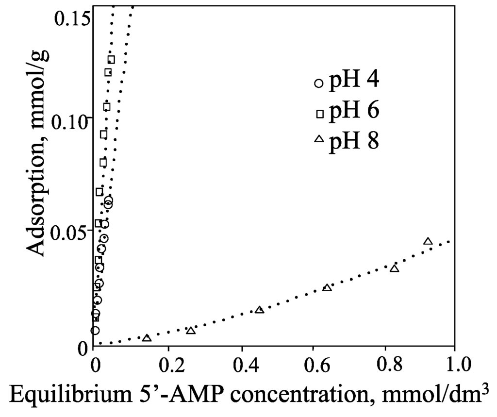 Hashizume and Theng [44] have determined the isotherms for the adsorption of adenine, adenosine, ribose, and 5'-AMP by allophane at pH 4, 6, and 8 (Figure 4, Figure 5, Figure 6 and Figure 7). Little adenine is adsorbed at all three pH values. As for adenine, adsorption of adenosine increases in the following order: pH 4 < pH 6 < pH 8 (Figure 5). A similar trend was observed with ribose (Figure 6). The adsorption of adenosine would be affected by the adenine component of adenosine. The ribose component of adenosine did not affect adenosine adsorption.