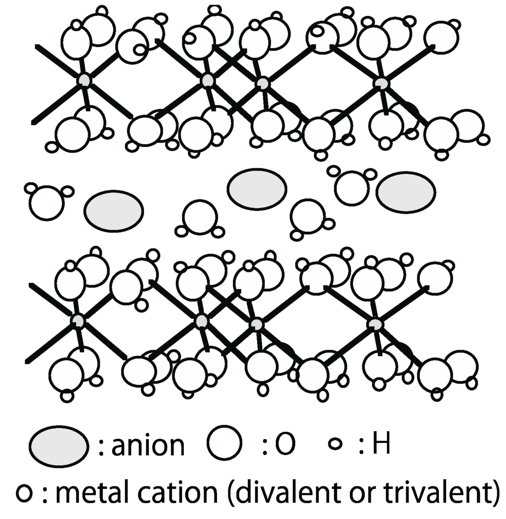 LDH is a clay mineral that can exchange anions. The crystal structure is shown in Figure 8. Natural LDHs have divalent and trivalent cations and the interlayer is occupied by anions (Table 3).