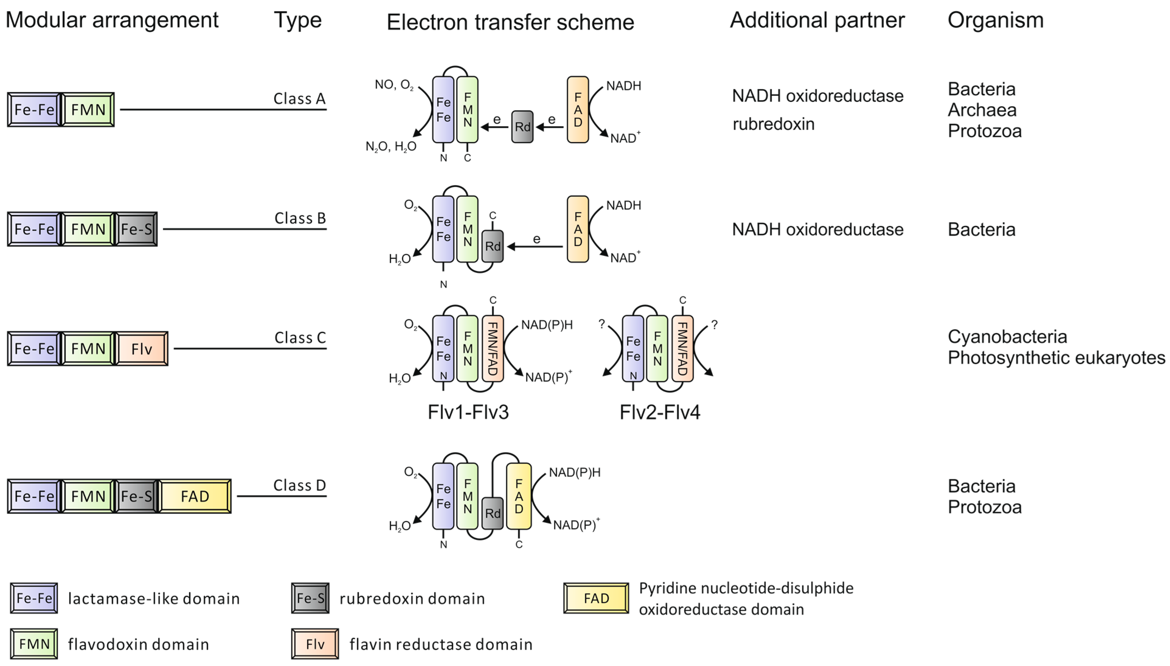 In addition to the common sequence core, some FDPs also have C-terminal extensions. Based on these C-terminal extensions, FDPs can be grouped into four classes [5] as depicted in Figure 1. The majority of FDPs belong to Class A, which is the simplest type with the shortest extension sequences, representing the minimal core structure. These can be found in Bacteria, Archaea and Protozoa. Class B FDPs are found in Enterobacteria, whilst Class D FDPs are present in some Bacteria and Protozoa. Class C FDPs seem to be specific to oxygenic photosynthetic organisms. The additional flavin reductase-like domain in this specific class makes it possible for nicotinamide adenine dinucleotide (phosphate), reduced form (NAD(P)H) to be directly used as an electron donor. The extension component is also coupled with extra cofactor(s), which bring additional features to FDPs during electron transfer. The number of redox partners required during electron transfer depends on the modular arrangement of FDPs. The more complex the FDPs, the fewer partners are involved. For example, rubredoxin donates electrons to many FDPs from Class A but is not needed for FDPs from Class B, which have a rubredoxin domain fused in the polypeptide.