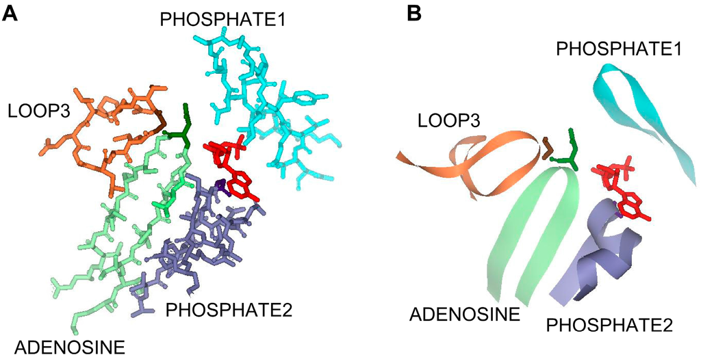 The active site region of the ATPase domain of MtACK (PDB: IG99) in (A) stick and (B) ribbon diagram. Residues shown conform to those in the alignment in Figure 2. ADP is shown in red, PHOSPHATE1 in light blue, PHOSPHATE2 is in light green with Asn211 in dark green, ADENOSINE is in light purple with Gly331 in dark purple, and LOOP3 is in light orange with Gly 239 shown in brown. For clarity, LOOP4 is not shown.