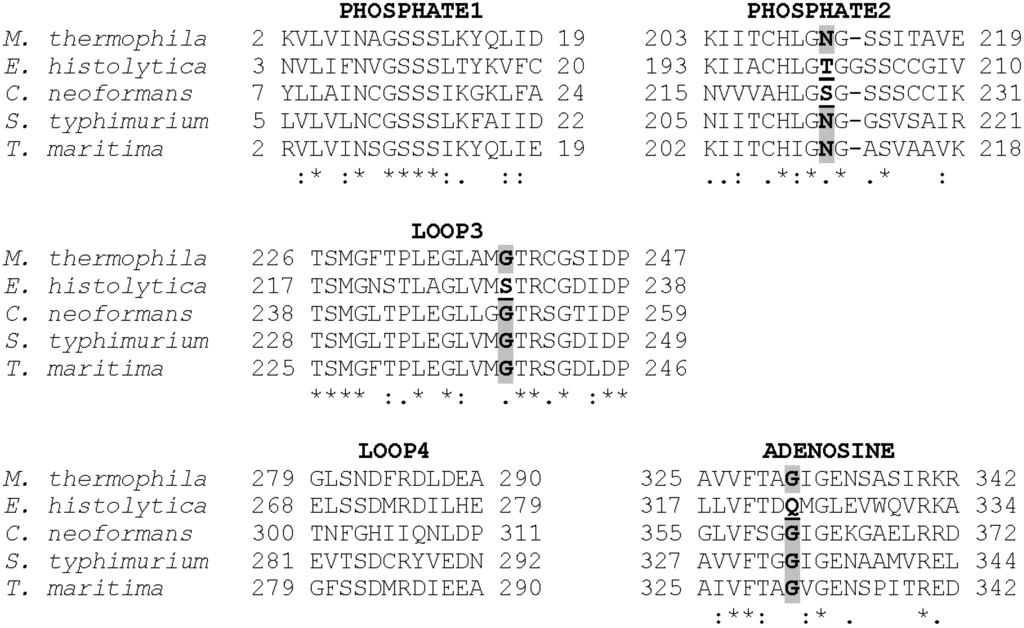 ACK sequence alignment showing the PHOSPHATE1, PHOSPHATE2, and ADENOSINE motifs as well as LOOP3 and LOOP4 which extend in toward the active site, as shown in Figure 1. Accession numbers: M. thermophila, GI:12084262; E. histolytica, GI:67481281; C. neoformans, GI:427930974; S. typhimurium, GI:16765664; Thermotoga maritima, GI:15643044.