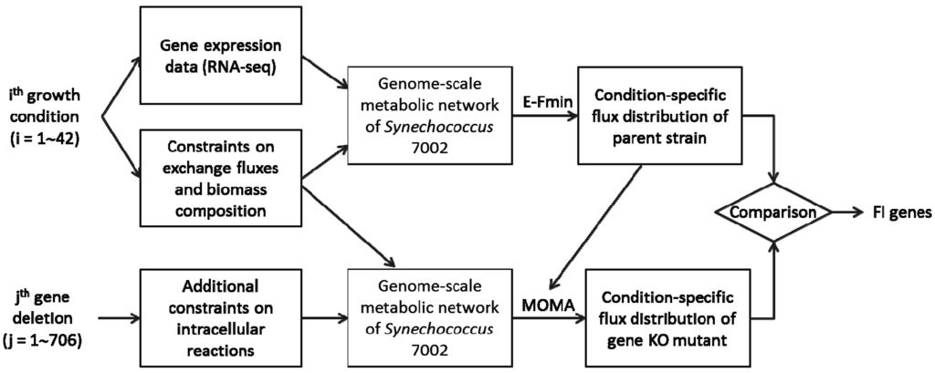 Analysis of the genome-scale metabolic network and identification of functionally important (FI) genes. The in silico knock-out simulations were conducted for all genes in the network (j = 1 to 706) under 42 expression-guided growth simulations (i = 1 to 42) to compare fluxes between the parent and knock-out networks as estimated via E-Fmin and MOMA, respectively.