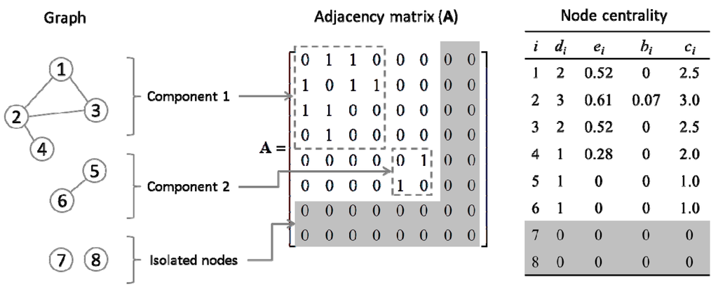 Graphical illustration of centrality concepts using a mock network. The nodes and edges, which represent genes and their co-expression relationships, respectively, are shown as an adjacency matrix (A). The graph is disconnected and the individual subgraphs are referred to as components. As centralities are zeros for isolated genes 7 and 8 (shaded in the table on the right), they can be optionally excluded from the adjacency matrix.