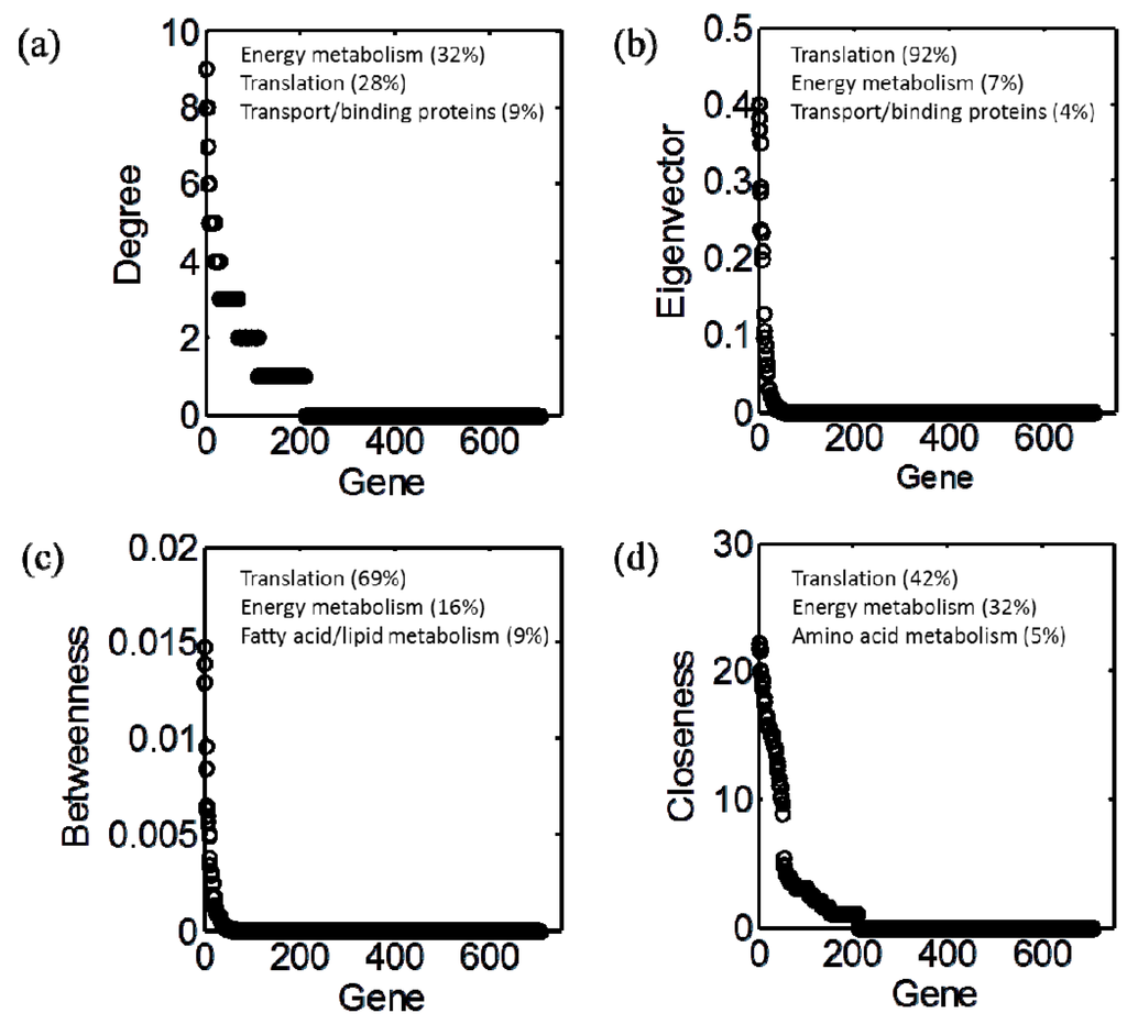 Distribution of gene centrality: (a) degree; (b) eigenvector; (c) betweenness; (d) closeness. In each panel, genes were sorted out in a descending order of the corresponding centrality measure.
