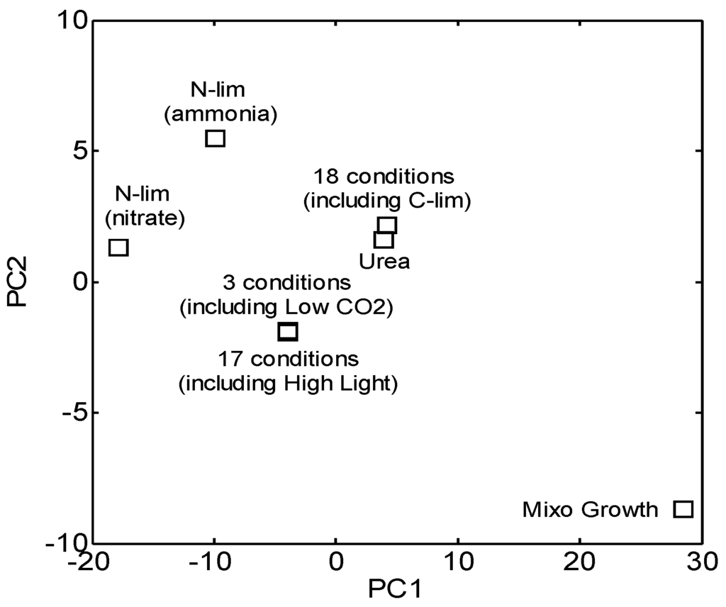 Principle component analysis (PCA) of estimated flux vectors in Synechococcus 7002 under 42 growth conditions. PCA identified only five different sets of conditions that lead to the difference in flux distribution. The first two principal components (PC1 and PC2) accounted for 99.4% of the variance.