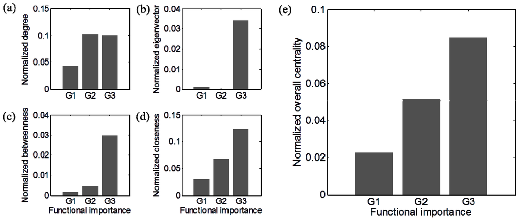 The relationship between topological and functional importance of genes: (a) degree; (b) eigenvector; (c) betweenness; (d) closeness; and (e) overall centrality. The overall centrality combines four individual centrality values. For normalization, each centrality measure was divided by its maximum value.