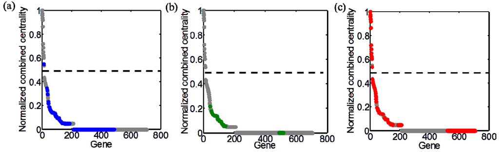 Distribution of genes with distinct functional importance along the combined centrality measure normalized by its maximum: (a) Group 1 (blue); (b) Group 2 (green); (c) Group 3 (red). Dashed line in each panel represents top 50% threshold.