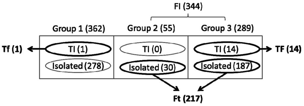 Classified gene groups by their functional and topological importance. 706 genes are divided into FI (i.e., Group 2 and Group 3) and unimportant genes (Group 1). Each group contains topologically important (TI) genes and isolated genes. Three sets of particular interest include TI but not FI (Tf), FI but not TI (Ft), and intersection of TI and FI (TF) genes as highlighted in bold. The numbers in parentheses represent the number of genes belonging to each set.
