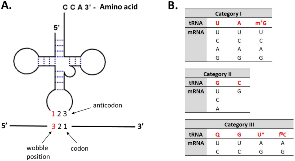 (A) An expanded wobble rule; (B) Possible pairings between the wobble nucleoside of tRNA and the codon third nucleoside of mRNA found in animal mitochondria. U *: cmnm5(s2)U, mnm5U, τm5U, τm5s2U (adapted from [64]).