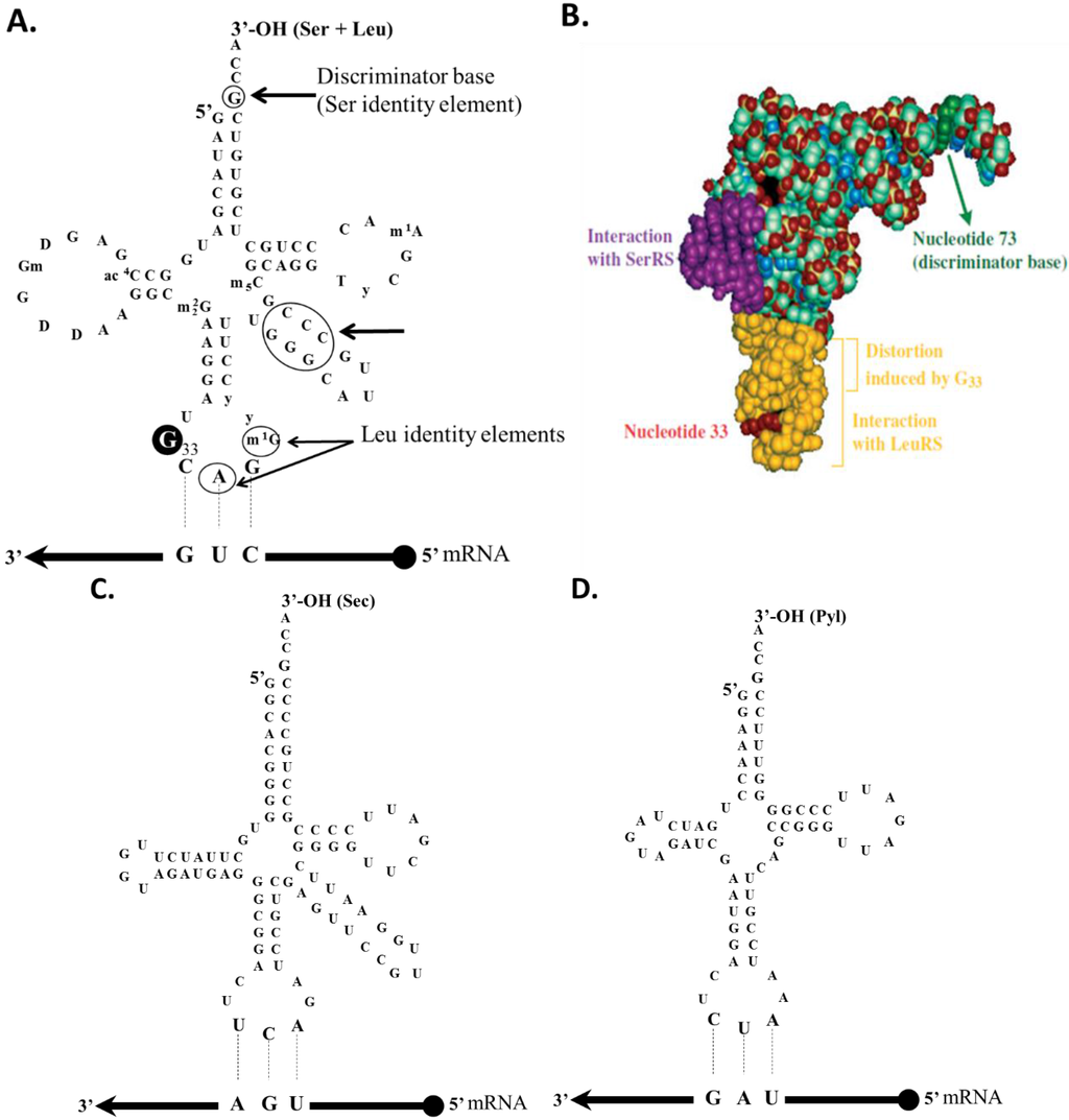 tRNA secondary structures. (A,B) A purine at position 33 (G33) in the C. albicans tRNA SerCAG anticodon loop replaces a conserved pyrimidine found in all other tRNAs and is a key structural element in the reassignment of the CUG codon from leucine to serine. Two other nucleotides in the anticodon loop, A35 and G37, are important for leucylation, and the discriminator base, G73, functions as a negative identity determinant for leucyl-tRNA synthetase (A73 is required for leucylation); (C) tRNAsSec from all domains of life are unusual in both length (>90 nt) and structure. Most tRNAs have 7 bp in the acceptor stem and 5 in the TΨC arm, while eukaryal and archaeal tRNAsSec exhibit a 9 bp in the acceptor stem and 4 in the TΨC arm. Eukaryotic and archaeal tRNASec species have 6 or 7 bp D-stems, respectively. Molecular modeling suggested that a 7 bp D-stem in archaeal tRNASec would compensate for the short 4 bp T-stem thus allowing for the normal interaction between the D- and T-loops; (D) tRNAsPyl has a smaller D-loop (4–5 bp). Only one base is found between the acceptor and D-stems, rather than two bases, and the almost universally conserved G-purine sequence in the D-loop and TΨC sequence in the T loop are lacking. The anticodon stem forms with six, rather than five, base pairs, leaving only a very short (three base only) variable loop (adapted from [3]).