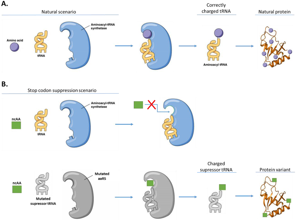 (A) Aminoacylation with canonical amino acids. tRNA aminoacylation is catalyzed by the corresponding aminoacyl-tRNA synthetase responsible for charging the tRNA with the cognate amino acid; (B) Stop codon suppression methods use heterologous orthogonal AARS:tRNA pairs to incorporate an orthogonal amino acid in response to a stop or quadruplet codon. This orthogonal amino acid is not a substrate for the endogenous tRNA and AARS (adapted from [104]).