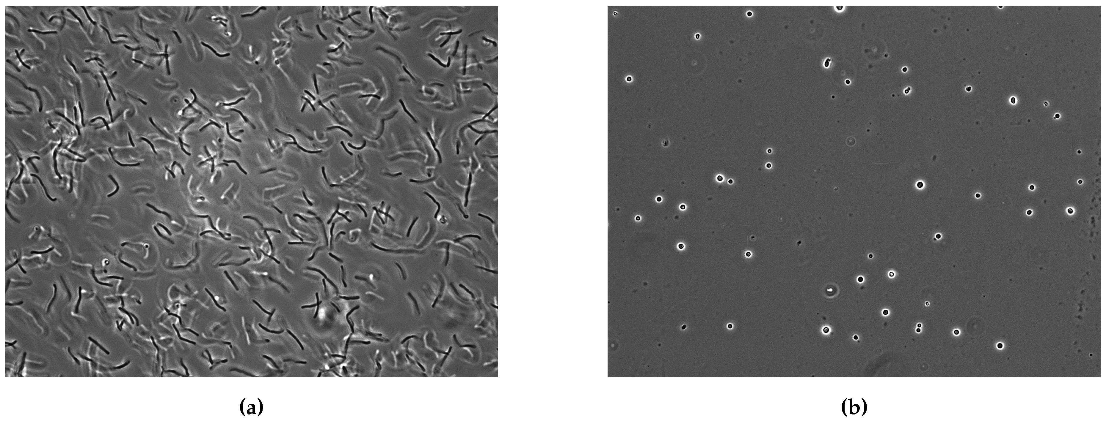 Phase contrast images of Methanothermobacter marburgensis and Methanosarcina soligelidi. (a) Phase contrast image (magnification 1000×) of M. marburgensis DSM 2133. Specimen was obtained in late exponential phase from a fed-batch fermentation. The cells are rod shaped and elongated; (b) Phase contrast image (magnification 1000×) of M. soligelidi DSM 26065. Specimen was obtained from a closed batch cultivation. The cells are coccoid.