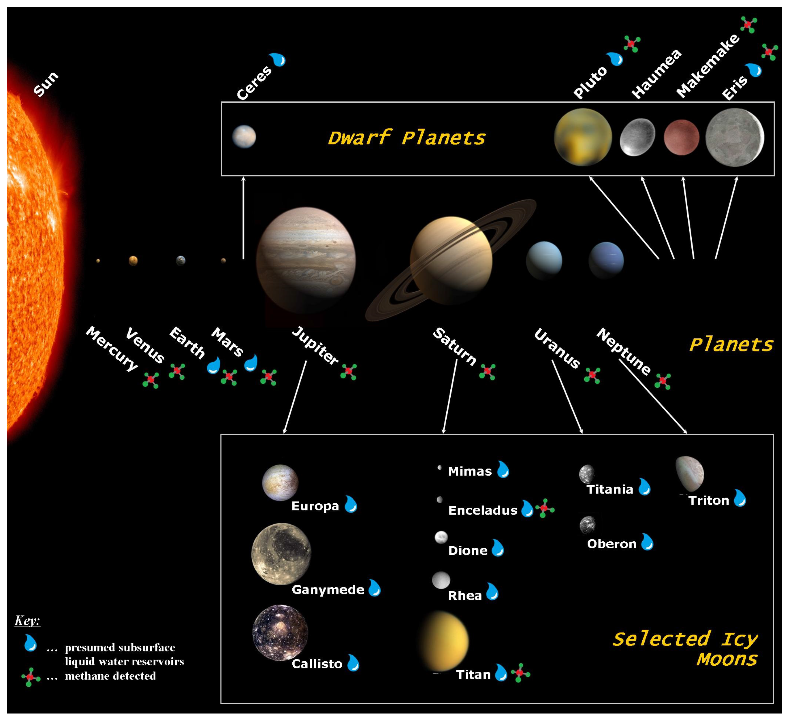 Of astrobiological interest are those Solar System bodies on which we assume at least local areas that could fulfil the physical and chemical requirements that methanogens could propagate in an extraterrestrial environment. This includes the residues of near-surface melt water on Mars and subsurface oceans or local seas on various icy moons like Europa or Enceladus.