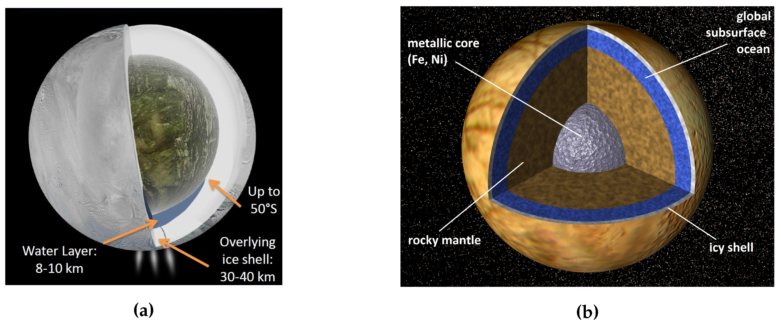 - Taubner, R.S.; Leitner, J.; Firneis, M.; Hitzenberger, R. Modelling the Interior Structure of Enceladus Based on the 2014’s Cassini Gravity Data. J. Orig. Life Evol. Biosph. 2015, 1–6. [Google Scholar] [CrossRef] [PubMed]