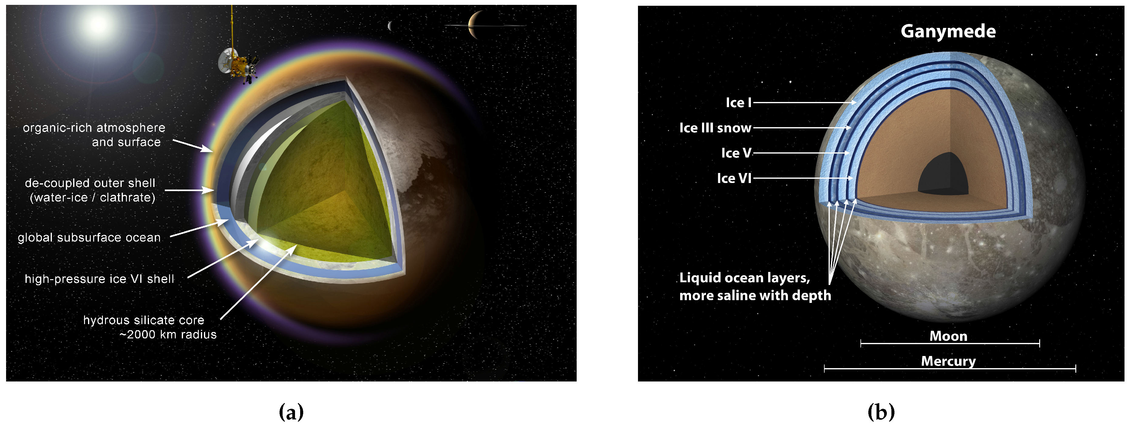 - Kerr, R.A. Cassini Spies an Ocean Inside Saturn’s Icy, Gassy Moon Titan. Science 2012, 336, 1629. [Google Scholar] [CrossRef] [PubMed]