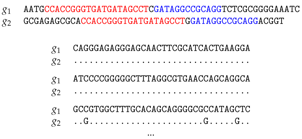 Illustration of anchors marked in red and blue for computing the anchor distance between the toy genomes and .