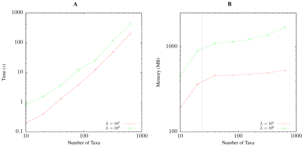 Time (A) and memory (B) required by andi to compute 1000 bootstrap replicates as a function of the number of taxa for sequences of 100 kb and 1 Mb length, L. The vertical line in (B) is at 24, the number of cores on the test computer.