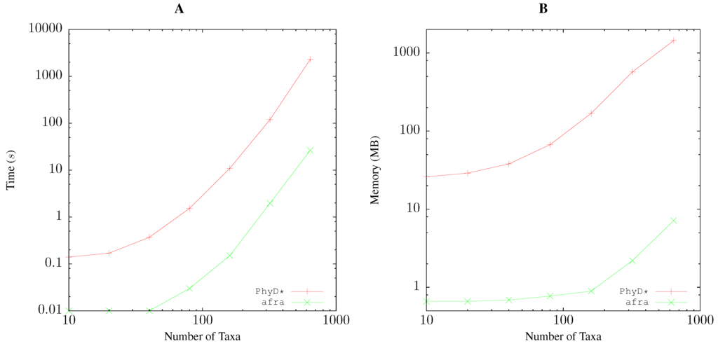 The memory consumption of afra is less than 1 MB for 100 taxa, while PhyD* uses approximately 100 MB for the same number of taxa (Figure 6B). However, memory consumption grows with similar rates for both applications.