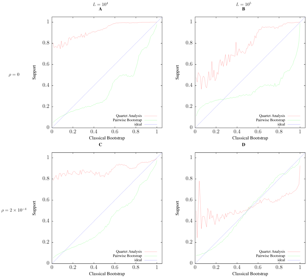 The panels in Figure 7 were generated from the output of this simulation by computing for each classical bootstrap value the average value of the two alternative support values.