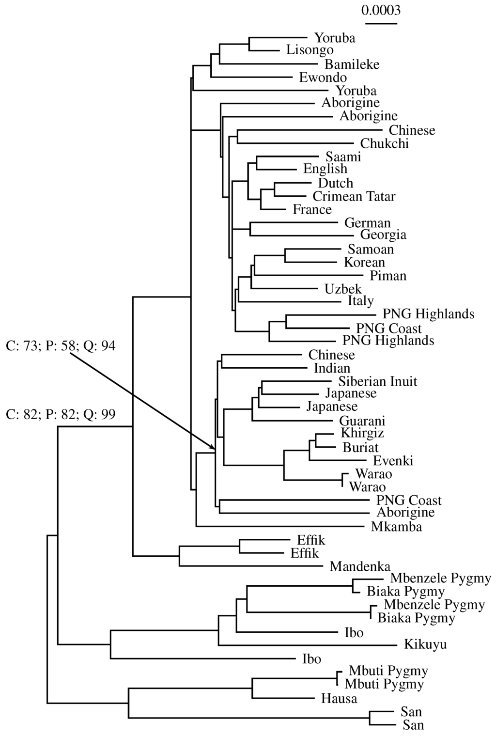 Phylogeny of humans computed from 53 complete mitochondrial genomes [14]. Example bootstrap support values are quoted for two nodes: C: classical alignment-based; P: pairwise bootstrap of andi distances; Q: quartet analysis of andi distances.