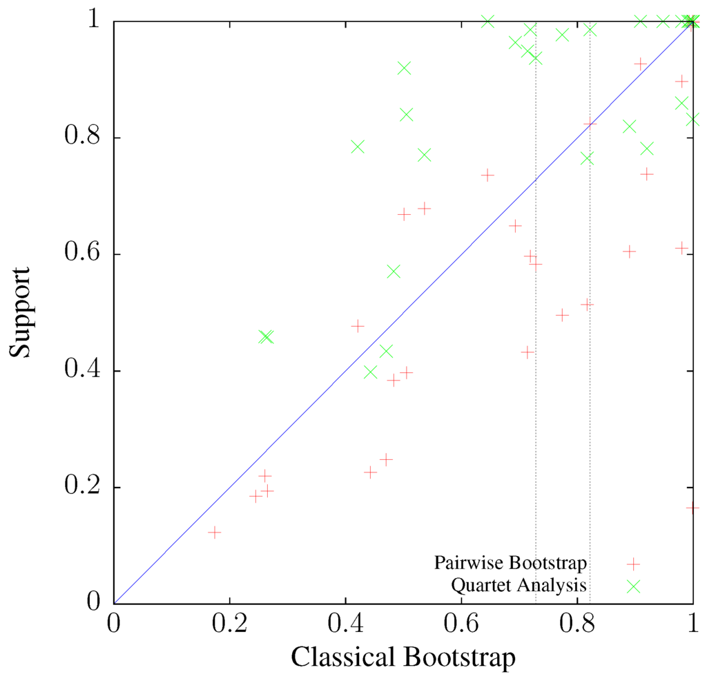 To investigate the relationship between classical bootstrap and its two alternatives further, the alternatives are plotted as a function of classical bootstrap in Figure 9. The vertical lines mark the two nodes annotated in Figure 8. Like in the simulations, it appears that pairwise bootstrap is more similar to its classical version than quartet analysis. Indeed, the correlation between classical and pairwise bootstrap is 0.829 (), while that between classical bootstrap and quartet analysis is only 0.777 (). Notice also the clustering of points in the top right hand corner of the graph, corresponding to a high frequency of clades with maximal support. This phenomenon was already noted when discussing the simulations shown in Figure 7.