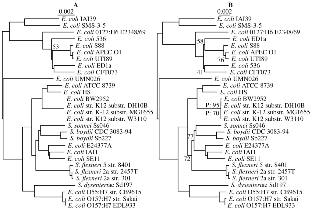 Phylogeny of 29 strains of Escherichia coli/Shigella computed from their full genomes. (A) Alignment-based; (B) andi-distances; the numbers refer to bootstrap support less than 100%; P: pairwise bootstrap; unmarked values in (B) refer to quartet support.