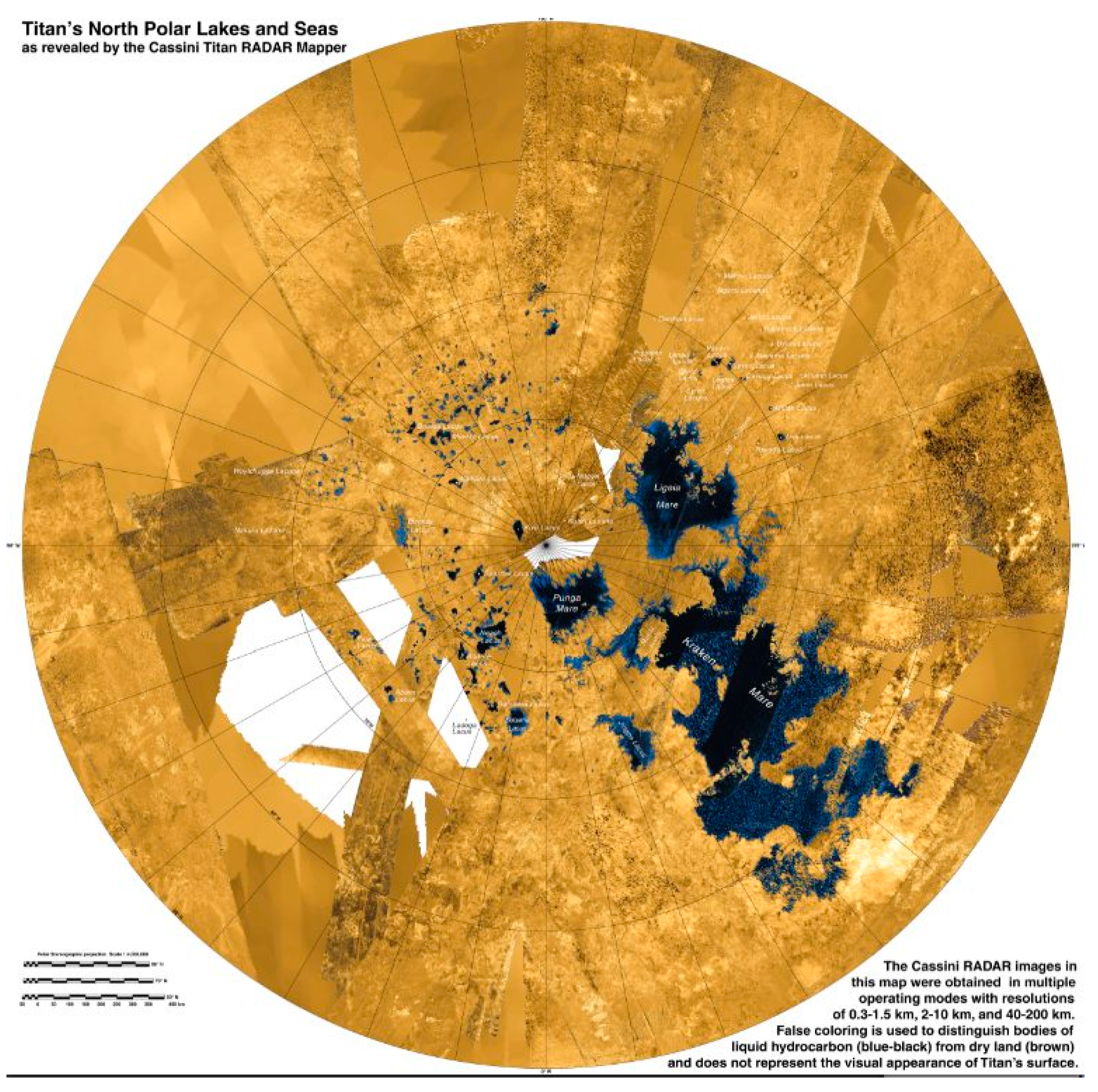 Lakes on Titan. False color map of the Northern Hemisphere down to 50°N shows Titan’s lakes in blue and areas that are not lakes in brown. The map is based on data from the radar on the Cassini spacecraft, taken during flybys between 2004 and 2013. Kraken Mare, the largest known lake on Titan is shown to the right and below the pole in this image. Above and right of the pole is Ligeia Mare, the second largest known lake. Image from NASA.
